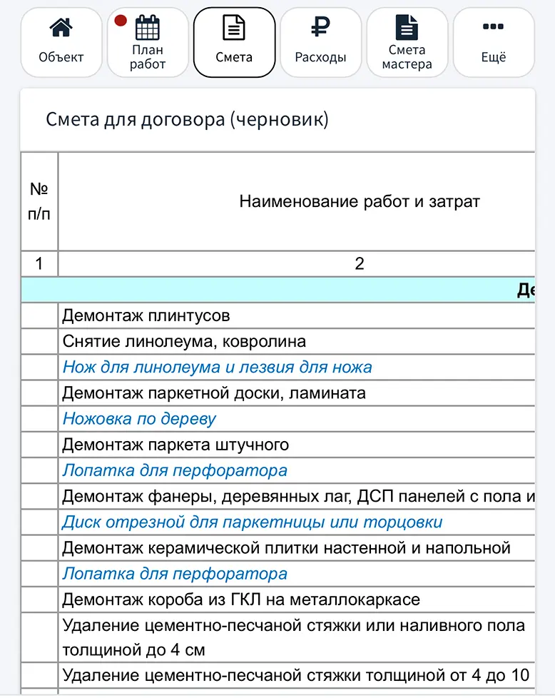 Мощный конструктор смет включает все необходимые работы и материалы. Система автоматически рассчитает точную стоимость ремонта, сэкономив Ваше время.